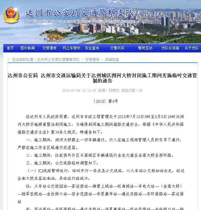 經(jīng)達(dá)州市人民政府同意,達(dá)州市市政工程管理處于2018年7月10日0時(shí)至8月9日24時(shí)對(duì)洲河大橋?qū)嵤┎『φ畏忾]施工,為確保封閉施工期間道路交通安全,根據(jù)《中華人民共和國道路交通安全法》第39條之規(guī)定,特通告如下: