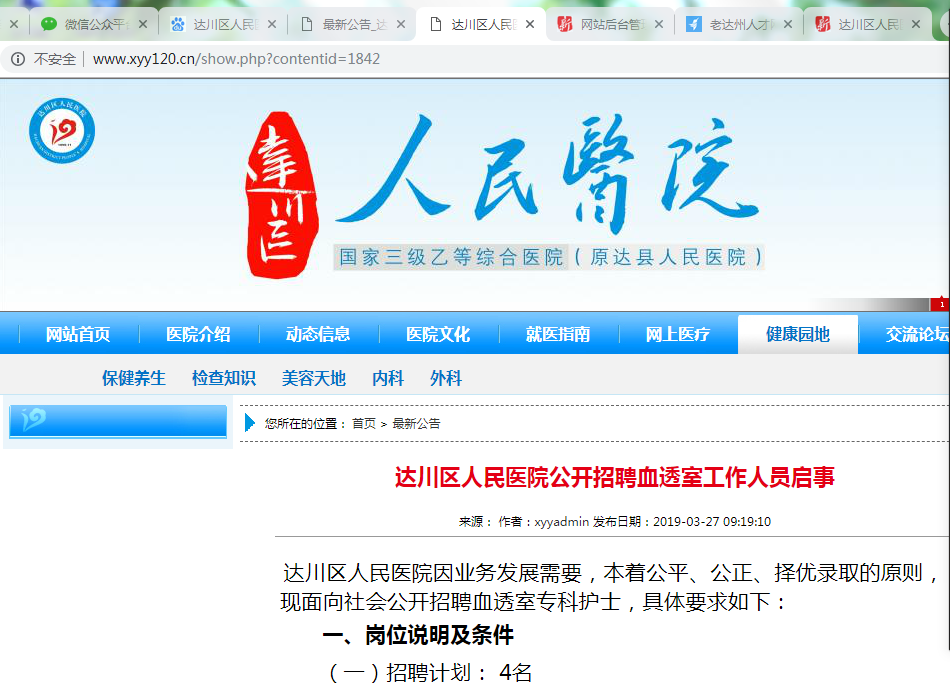 達川區(qū)人民醫(yī)院因業(yè)務(wù)發(fā)展需要,本著公平、公正、擇優(yōu)錄取的原則,現(xiàn)面向社會公開招聘血透室??谱o士,具體要求如下: