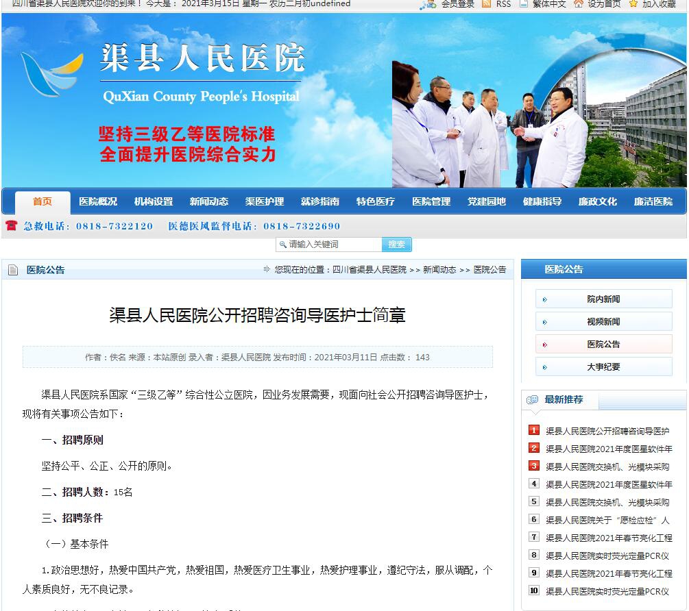 達(dá)聘網(wǎng)(www.0818rc.net)達(dá)州人才網(wǎng)訊,渠縣人民醫(yī)院系國家“三級乙等”綜合性公立醫(yī)院,因業(yè)務(wù)發(fā)展需要,現(xiàn)面向社會公開招聘咨詢導(dǎo)醫(yī)護(hù)士,現(xiàn)將有關(guān)事項(xiàng)公告如下: