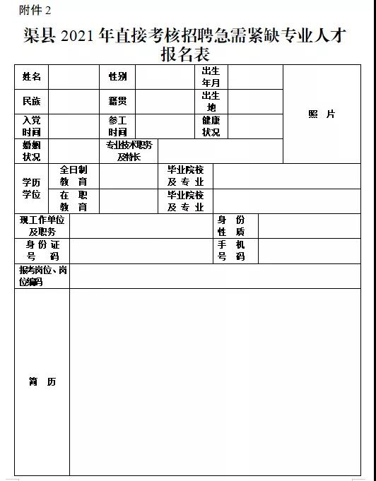 2.渠縣2021年直接考核招聘急需緊缺專業(yè)人才報(bào)名表